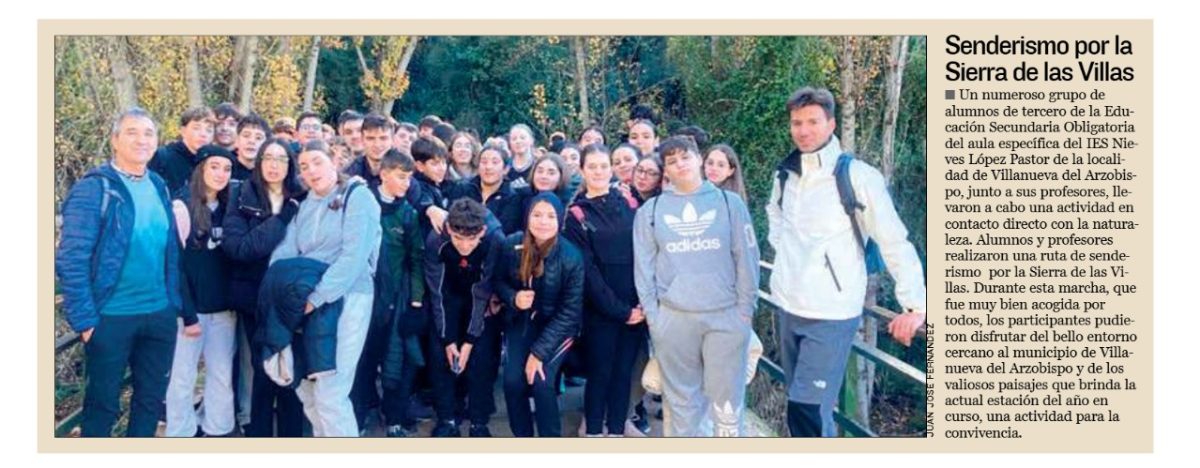 Un numeroso grupo de alumnos de tercero de la Educación Secundaria Obligatoria del aula específica del IES Nieves López Pastor de la localidad de Villanueva del Arzobispo, junto a sus profesores, llevaron a cabo una actividad en contacto directo con la naturaleza. Alumnos y profesores realizaron una ruta de senderismo por la Sierra (sic) de las Villas. Durante esta marcha, que fue muy bien acogida por todos, los participantes pudieron disfrutar del bello entorno cercano al municipio de Villanueva del Arzobispo y de los valiosos paisajes que brinda la actual estación del año en curso, una actividad para la convivencia.