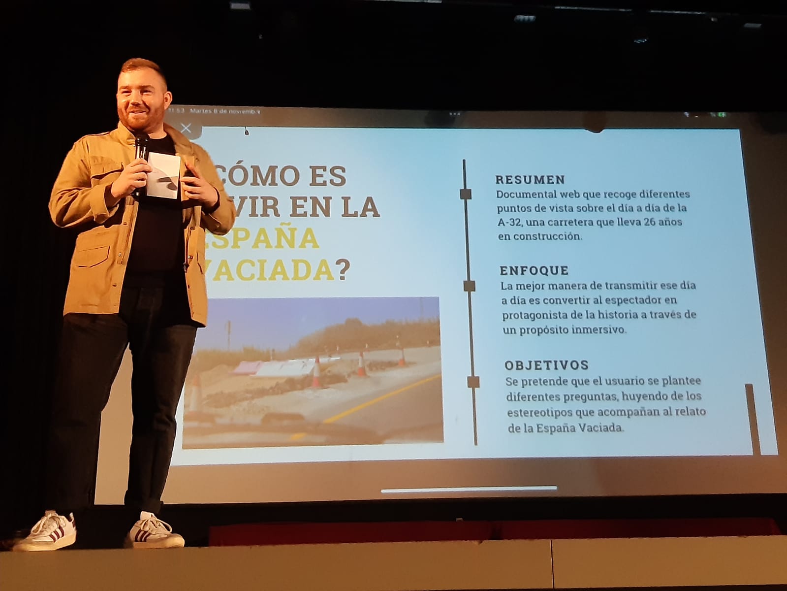 Nos ha presentado su corto “Desvío permanente”, en el cual relata las vicisitudes en la ejecución de la carretera A-32, que lleva 22 años en construcción así como la realidad que vivimos en la España vaciada.