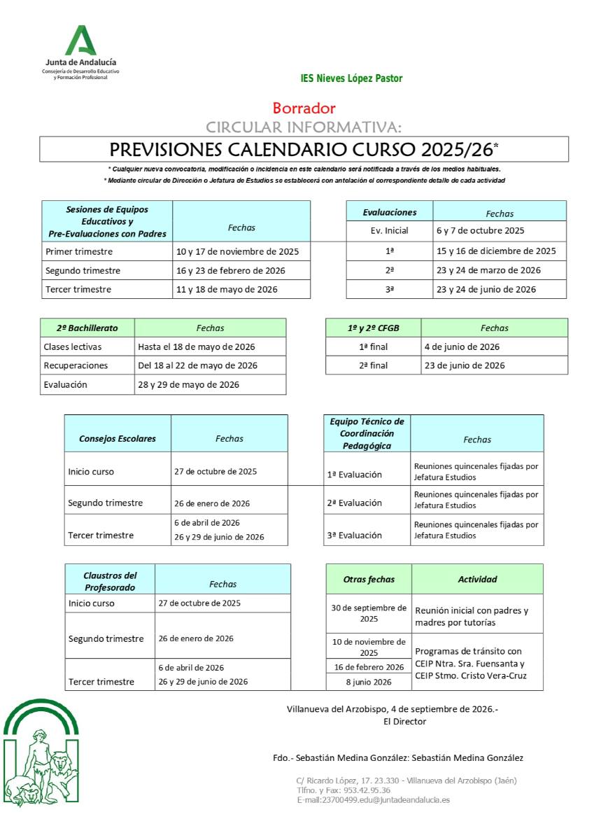 Horarios y calendario Horarios de tutorías Lunes, de 16:30h a 17:30h (conviene concertar la cita con el/la tutor/a). Tel: 953 42 95 36 ¿Qué días son festivos? Calendario escolar de este curso ¿Cuándo son las evaluaciones? Comparte en tus redes: